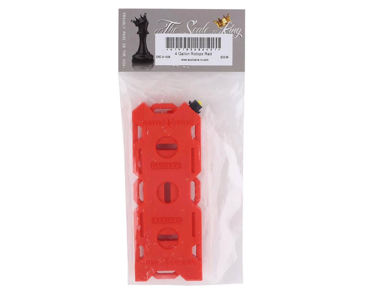 The Exclusive RC SCX6 1/6 Scale 4 Gallon Rotopax is a great way to add detail to your truck. These Rotopax are designed in different colors to make easy reference of what each container holds. This red container is designed to hold gasoline and features a faux fuel cap. Package includes one faux Rotopax can.