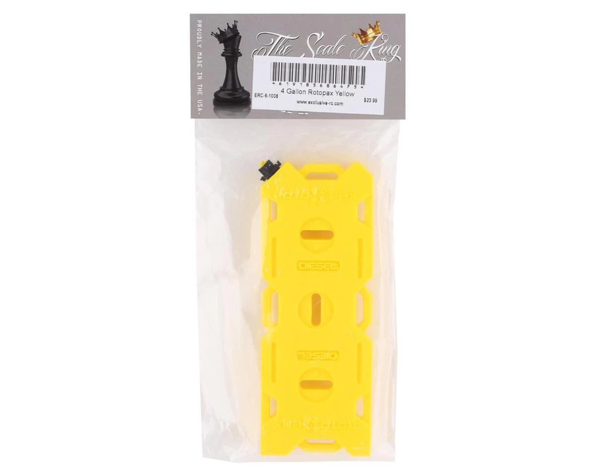 The Exclusive RC SCX6 1/6 Scale 4 Gallon Rotopax is a great way to add detail to your truck. These Rotopax are designed in different colors to make easy reference of what each container holds. This yellow container is designed to hold diesel and features a faux fuel cap. Package includes one faux Rotopax can.